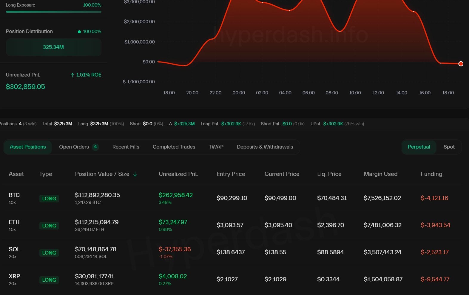 - A crypto whale trader opened substantial long positions in Bitcoin, Ethereum, Solana, and XRP, totaling $325 million.