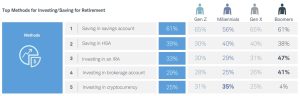 Investing in cryptocurrency is one of the top five methods for retirement savings, the report further shows. It is the second most popular method for retirement savings for Gen Z respondents and the third most popular for millennial respondents.