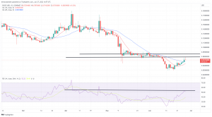 This point, at 50, is one of the only current obstacles in the way of the token recapturing its long-term resistance level at $0.07560.