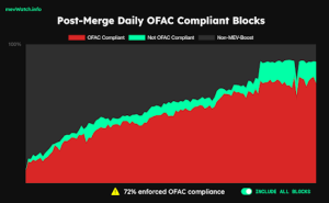 Post-merge, a majority of Ethereum’s blocks are compliant with OFAC. This is a potential problem because OFAC-compliant relays will not include any transactions that interact with the Tornado Cash smart contract or other sanctioned wallet addresses as designated by OFAC. Not all blocks built by OFAC compliant relays are censoring, however, all blocks built by OFAC compliant relays will censor when non-compliant transactions are broadcast to the network. As Martin Köppelmann, the co-founder of Gnosis, noted about the state of OFAC compliant relays, “[t]his means if the censoring validators would now stop attesting to non-censoring blocks they would eventually form the canonical, 100% censoring chain.”