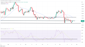 As can be seen from the chart, the rise in price comes as the RSI climbs above a ceiling at 42.00, and is currently tracking at 42.50.