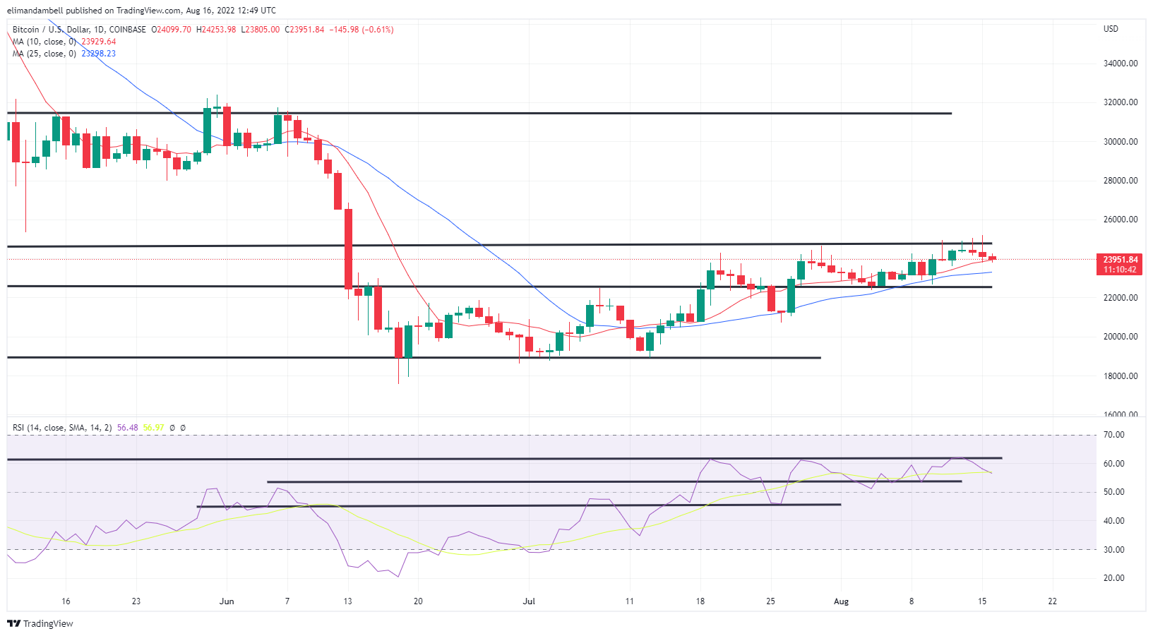 As of writing, BTC/USD fell to an intraday low of $23,839.77, as prices dropped for a fourth consecutive session.
