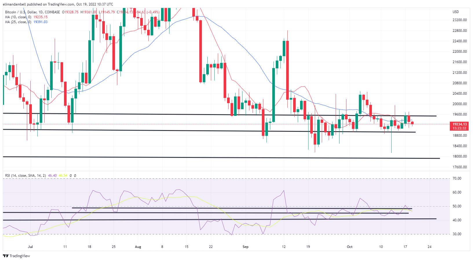 Following a high of $19,655.75 on Tuesday, which saw BTC/USD move past the aforementioned ceiling, prices slipped to a low of $19,144.77 earlier today.