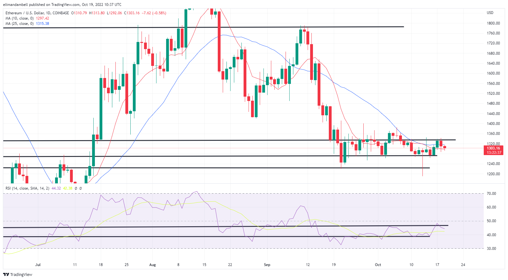 Like BTC, ethereum (ETH) fell for a second consecutive day, as the token moved below the $1,300 level.