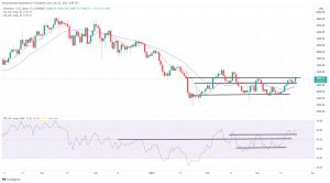 Tuesday’s surge in price comes as the 14-day RSI moved past its recent ceiling of 54.40, and is now tracking at 57.7, which is another multi-week high.