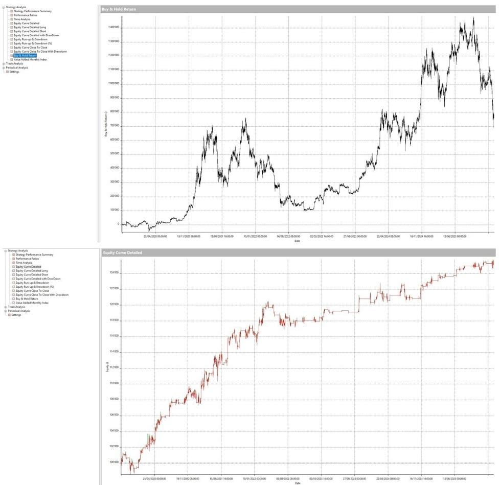Figure 3 – Comparison between the performance of Bitcoin Buy & Hold (above) and the equity line generated by a trading system on Bitcoin (below).