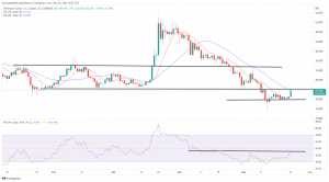 Looking at the chart, the Relative Strength Index is currently tracking at a resistance point of 45.70, which hasn’t been broken since early April.
