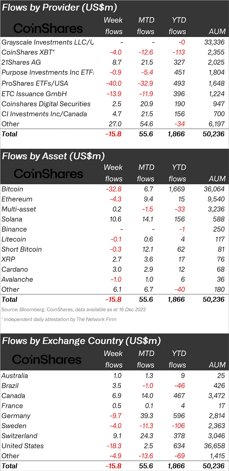 “Cryptocurrency investment products saw small outflows totaling $15.8 million last week, ending an 11-week streak of inflows.