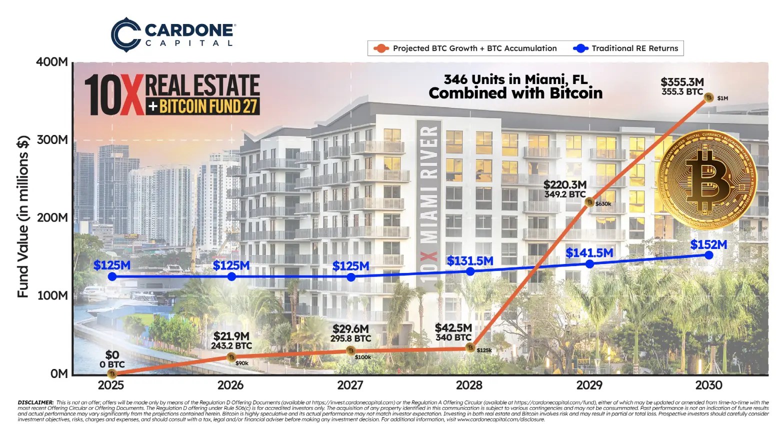 One highlight includes a flagship asset: 346 units in Miami, Florida, where projected fund value growth is modeled to significantly outperform traditional real estate returns when Bitcoin exposure is added.