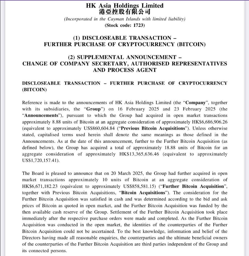 In an X post, HK Asia Holdings revealed that it acquired an additional 10 Bitcoins worth around $858,581, raising its total BTC holding to 18.88 coins.