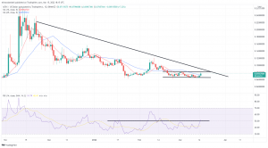 If this ceiling is broken, we could see a bull run similar to what occurred on February 8, when prices rose to a peak of $0.1290.