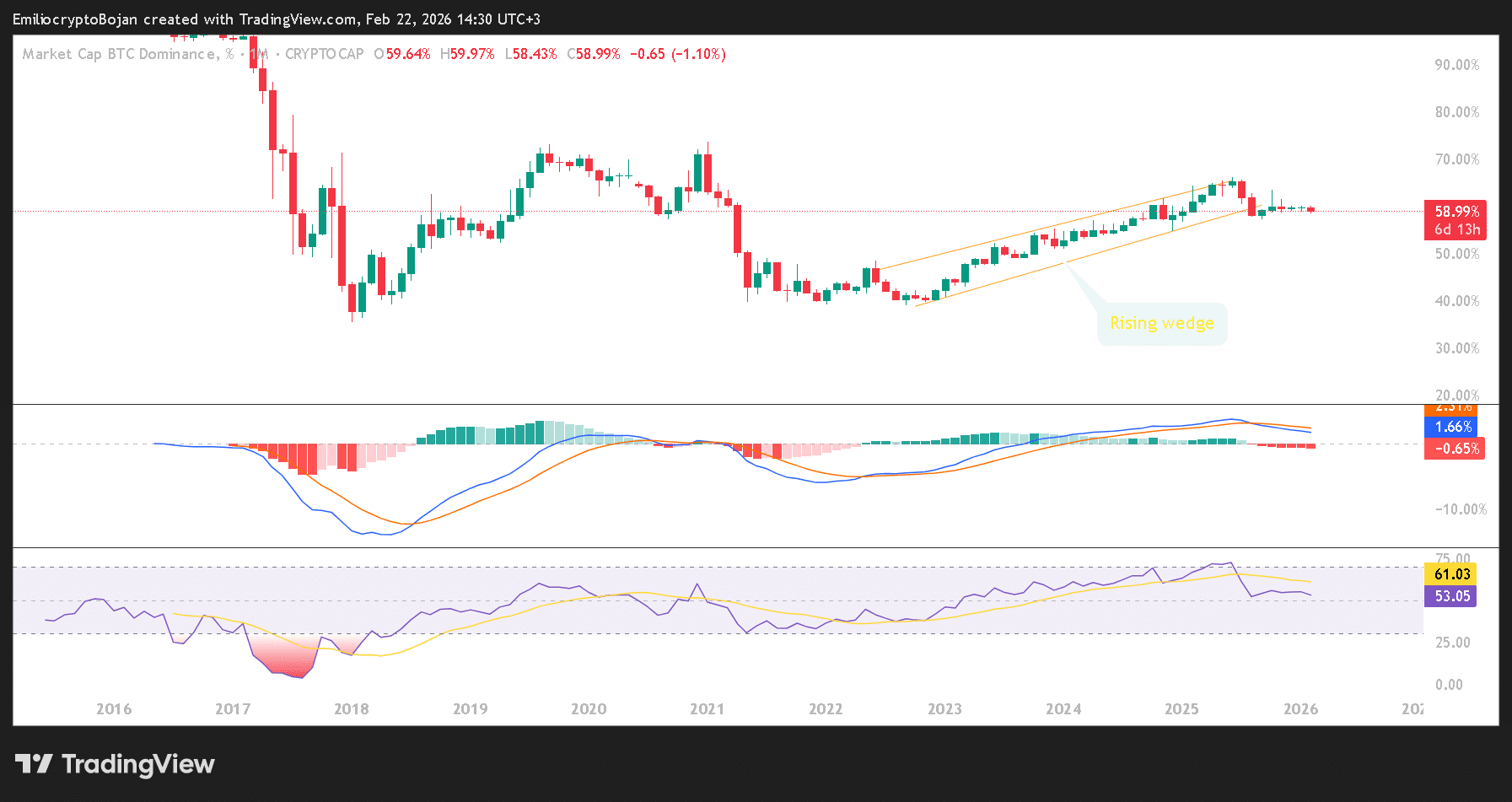 BTC Dominance formed a rising wedge on the weekly chart. Price then broke below the wedge’s lower trendline.
