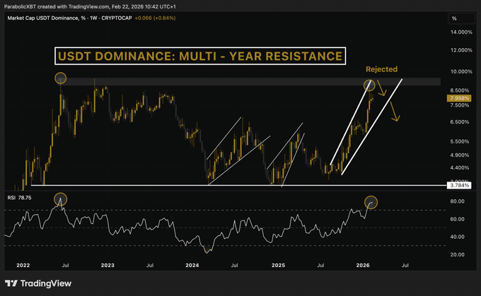 USDT Dominance reached 9%, the same resistance that marked cycle turning points in June and November 2022. The weekly chart printed a sharp upper wick, confirming rejection rather than continuation.
