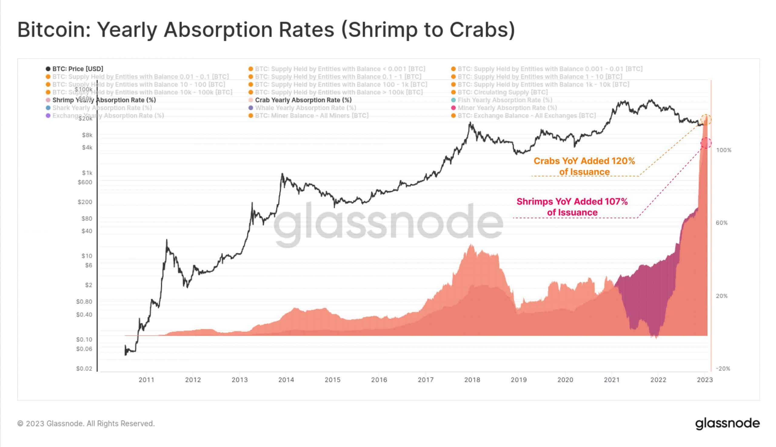 Additionally, the issuance of Bitcoin across various addresses also played a role in the current BTC price rally. For example, Shrimps, which are smallholders of Bitcoin, added 107% of top Bitcoin’s issuance, while Crabs, which are medium-sized holders, added 120% of issuance.