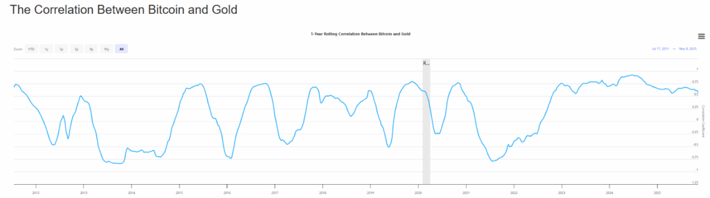In many studies, the average correlation between Bitcoin and gold returns is found to be low, often close to zero, while the relationship tends to vary significantly over time. There are phases where the two assets move in the same direction, especially during periods dominated by the search for “hard assets” as protection against inflation and geopolitical uncertainty, but there are also intervals where the correlation weakens or even turns negative. This indicates that there is no structural and stable relationship between the two, but rather an episodic connection, heavily dependent on the macroeconomic context and the prevailing narrative at a given time.