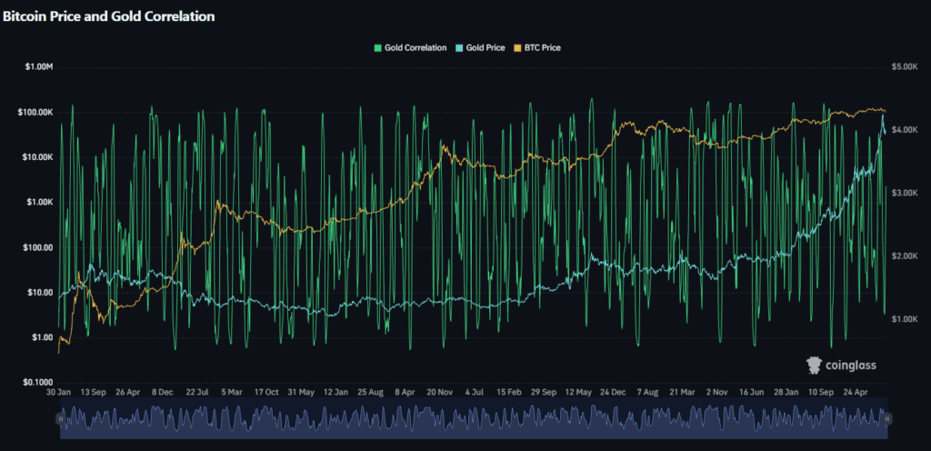 Figure 3 – 30-day rolling correlation between Bitcoin and Gold (source Coinglass.com)