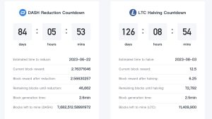 While Bitcoin’s halving is expected to happen in less than 400 days, Litecoin’s reward halving is estimated to occur this year. According to current LTC block times, the Litecoin network will halve on Aug. 3, 2023. Litecoin rewards will be reduced from 12.5 LTC to 6.25 LTC, and there are roughly 11.4 million LTC blocks left to mine. Although it’s not quite a halving, the Dash network is expected to see a reward reduction in 84 days, according to current statistics. After the reduction, the reward will shrink from 2.763 DASH to 2.566 DASH.