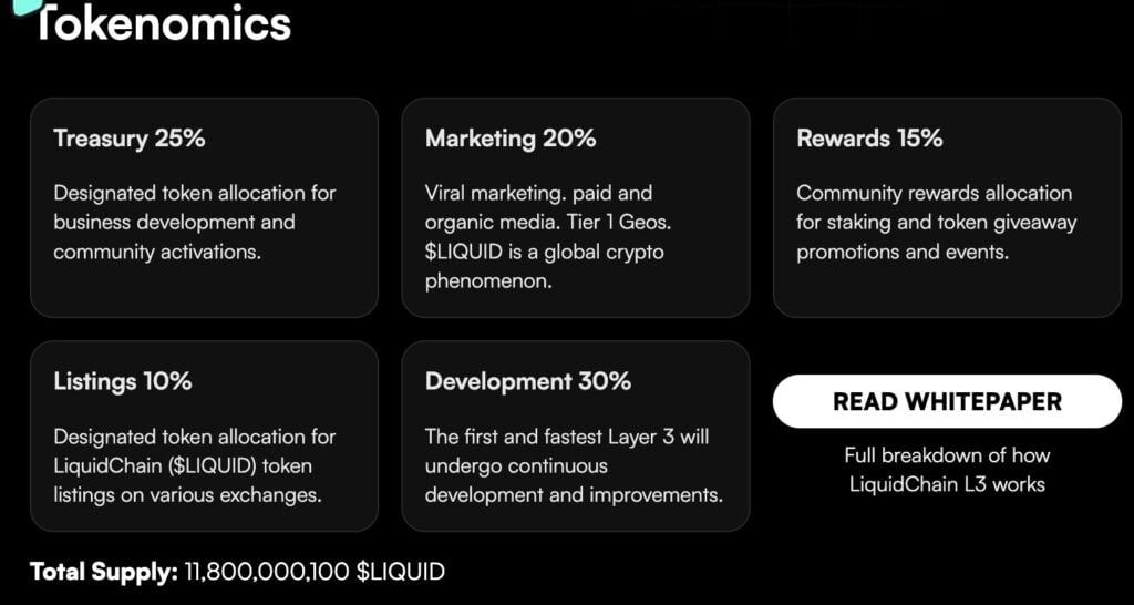 LiquidChain uses the $LIQUID token to support activity inside the system. The token helps manage fees, validator incentives, and network usage.