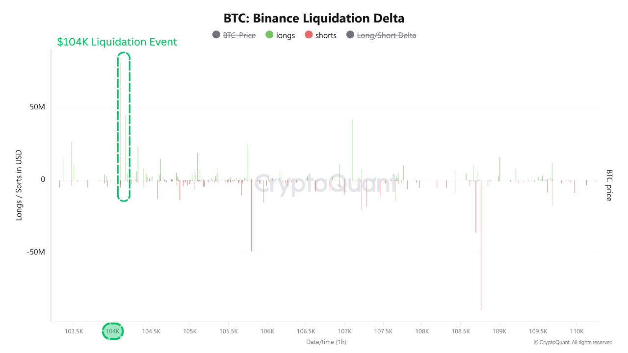 The BTC: Binance Liquidation Delta chart reveals that long positions were heavily liquidated at the $104K level, as shown by green spikes in the delta metric.