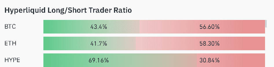 BTC traders leaned net short at 56% versus 43% long, while ETH showed an even heavier short bias near 58%. However, HYPE flipped the setup with 69% long dominance.