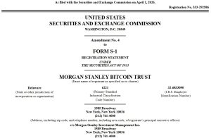 Morgan Stanley, a global investment bank and asset management firm, filed Amendment No. 4 to its Form S-1 registration statement with the U.S. Securities and Exchange Commission (SEC) on April 1 for the Morgan Stanley Bitcoin Trust, outlining plans to list the bitcoin exchange-traded fund (ETF) on NYSE Arca under the ticker MSBT. The filing describes a passive vehicle designed to track bitcoin’s price performance using a benchmark index.