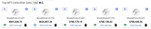 The top NFT collection in terms of sales over the last week was Bored Ape Yacht Club (BAYC) with $19,052,102 in sales, a 52.82% increase from the previous week. BAYC was followed by Mutant Ape Yacht Club (MAYC), Azuki, Bored Ape Kennel Club (BAKC), and The Captainz. Cryptopunks and Mineablepunks took the sixth and seventh positions in terms of seven-day NFT sales by collection.