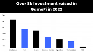 According to DappRadar, major VCs invested a record $4b in GameFi in 2021, compared to $80m in 2020. The capital invested in GameFi in 2021 is 5,000% higher than in 2020 and in 2022 more than $6b has already been raised in the GameFi industry for companies such as Mobox, Sandbox and Epic Games, etc.