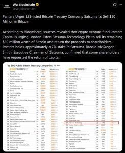 - Pantera Capital is pressing LSE-listed Satsuma Technology to sell $50M in bitcoin.