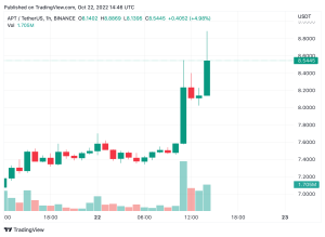 Market stats show the APT token has been trading for prices between $7.24 today up to $8.65 per unit. The Aptos blockchain currency is up more than 20% from the low recorded three days ago at $6.73 per coin.