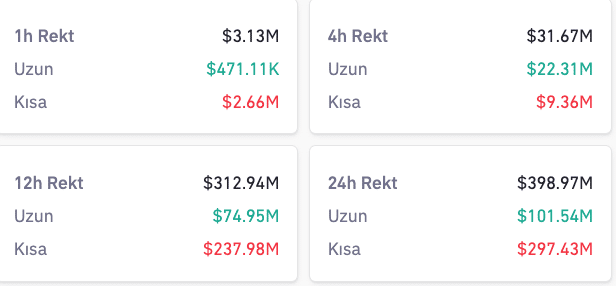 According to data from Coinglass, nearly $400 million worth of positions have been liquidated in crypto futures in the last 24 hours. Of this, $297.4 million consisted of short positions and $101.5 million consisted of long positions.