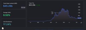 Currently, defi statistics show that from Dec. 18, 2022, to Jan. 17, 2023, or 30 days, the total value locked (TVL) in defi increased by $5.39 billion. At the time, 30 days ago, the TVL in defi was around $39.9 billion, and it has since grown to $45.29 billion. The largest and most dominant defi protocol on Jan. 17 is the liquid staking solution Lido.