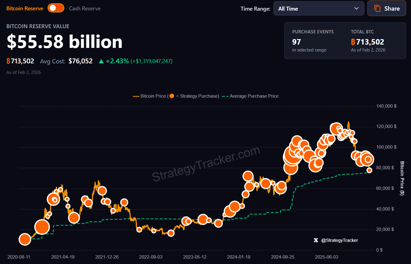 With this purchase, Strategy’s Bitcoin holdings reach 713,502 BTC, valued at more than $55 billion. The company holds roughly $1.3 billion in unrealized profits, after briefly slipping into losses during Bitcoin’s sharp weekend sell-off.