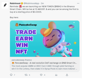 The tweet read: “Reminder, we are launching our NEW TOKEN ($RBH) on the Binance Smart Chain. Will be live at 12 AM EST. You can be among the first to buy at a starting price of $0.0005.” The tweet, which originated from the @Robinhoodapp account, also included a link to the Pancakeswap platform, where the Binance Smart Chain (BSC) token is listed.