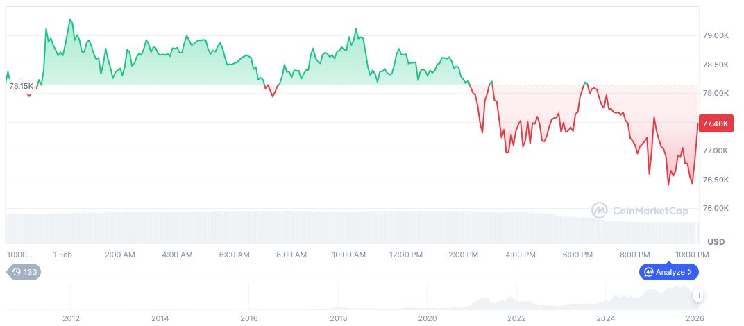 According to CoinMarketCap, Bitcoin’s current price stands at $77,511.94, with a market cap of 1.55 trillion and 24-hour trading volume of $53.46 billion, reflecting a 23.93% decrease in trading activity. Over the past 90 days, Bitcoin has seen a price decline of 27.18 percent.