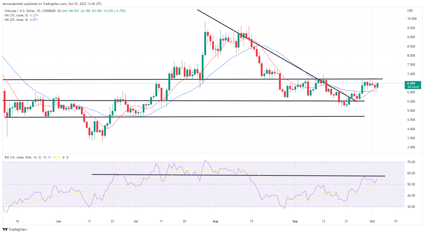 The move saw uniswap move close to a key resistance point of $6.70, which has been in place since August 25.