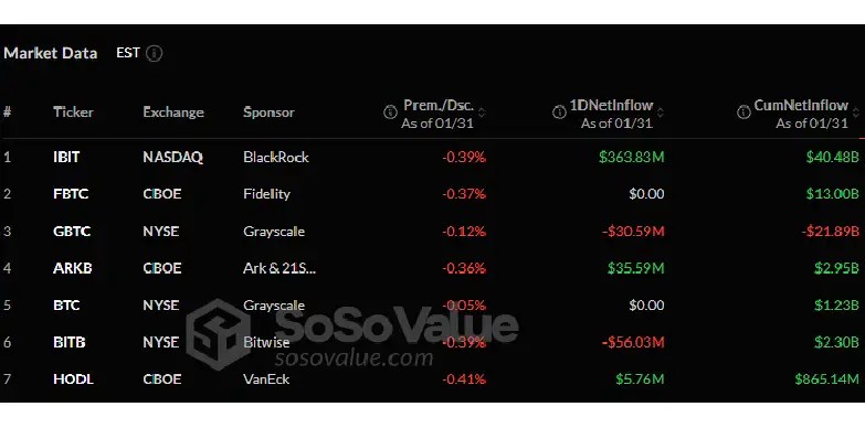 According to SoSoValue, the daily net inflow of the U.S. spot BTC ETF market was $318.56 million, bringing the cumulative total net inflow to $40.50 billion. The inflows as of January 31 saw $363.83 million locked in from IBIT (BlackRock). Inflows also include: $35.59 million from Ark & 21Shares (ARKB) and $5.76 million from VanEck (HODL).