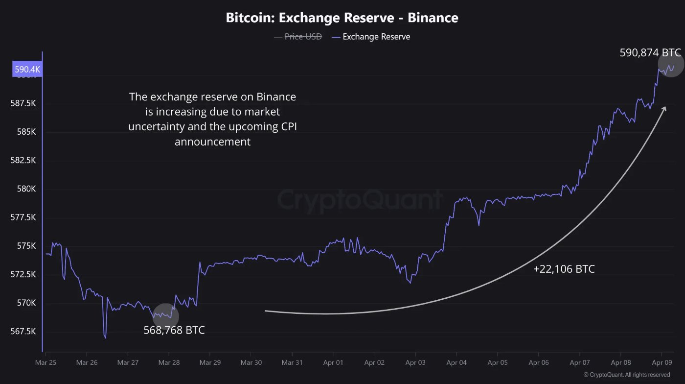Data from CryptoQuant reveals a significant increase in Bitcoin reserves on Binance, with an influx of 22,106 BTC recorded recently. The report highlights a strong acceleration in BTC inflows to the exchange, amid the ongoing macro uncertainty and the upcoming announcement in Consumer Price Index (CPI).