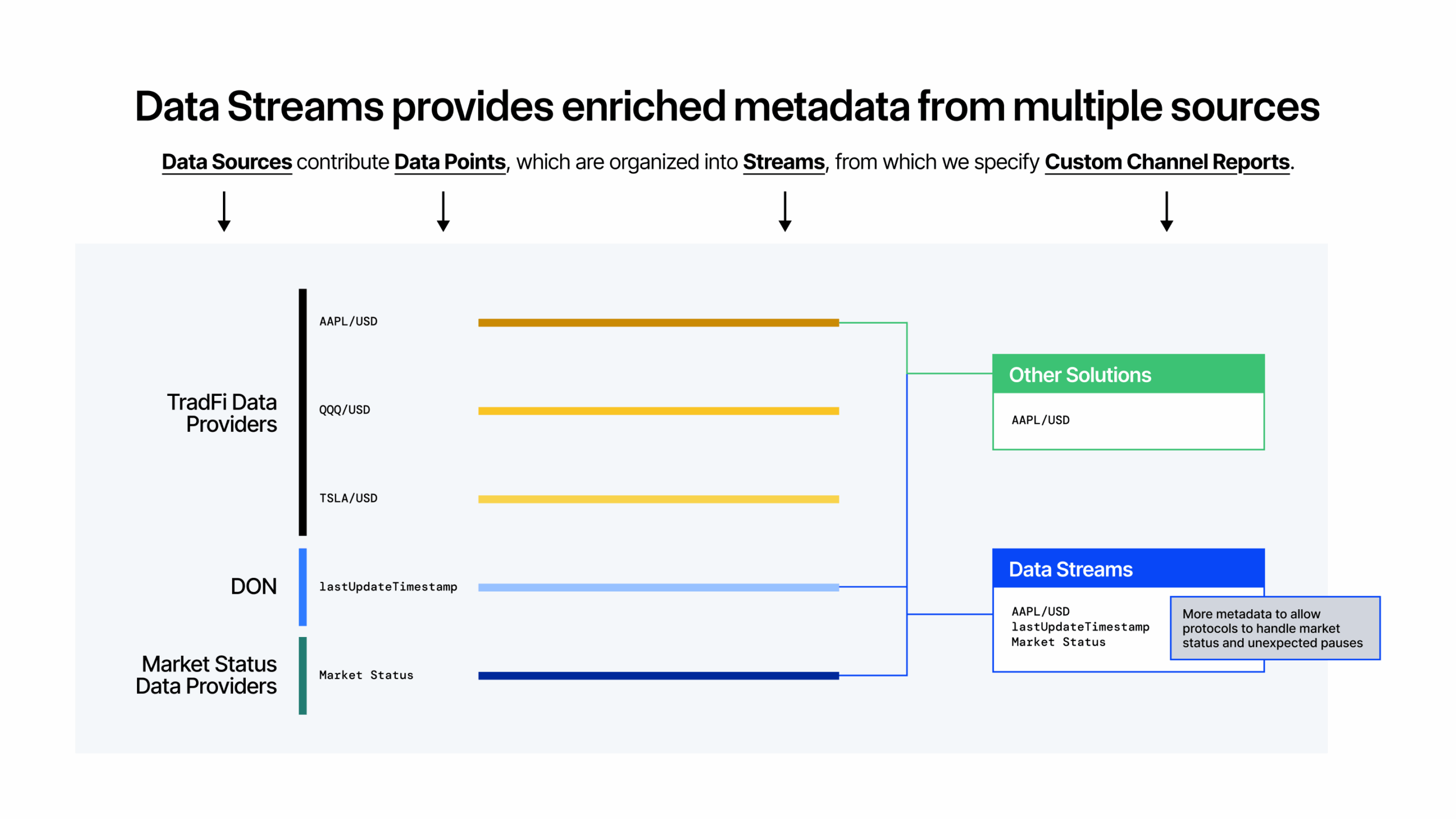 Chainlink Data Streams will aggregate input from multiple primary and backup data sources, thereby enhancing uptime and reliability. This aggregated data will then be processed by decentralized oracle networks (DONs) and transmitted on-chain via a structured schema.