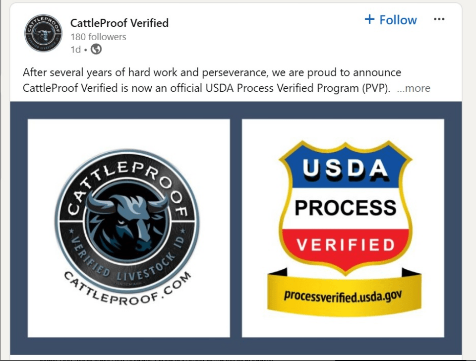 What makes CattleProof unique is that it is a USDA-approved PVP using blockchain. Services include being certified with “Born in the USA” as well as digital certificates with backlinks directly to the animal data. The company is also integrated with Heartland Payments, which presents the opportunity for direct transactions of verified cattle.