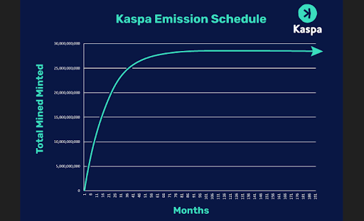 Kaspa’s native cryptocurrency, KAS, has a maximum or total supply of 28.7 billion coins that are not pre-mined. This means all of the tokens in circulation have been free-mined by miners on the blockchain. It has a circulating supply of 22.5 billion at the time of publication, and estimates are that with the current halving model, the last KAS coin will be mined in 2037.