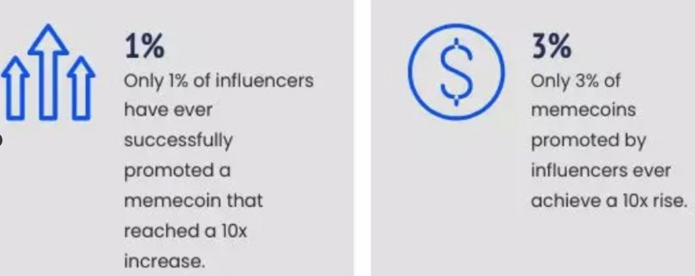 According to the report, it is nearly impossible to attain a tenfold gain with influencer-backed memecoin promotions since only 1% of these will hit that growth rate.