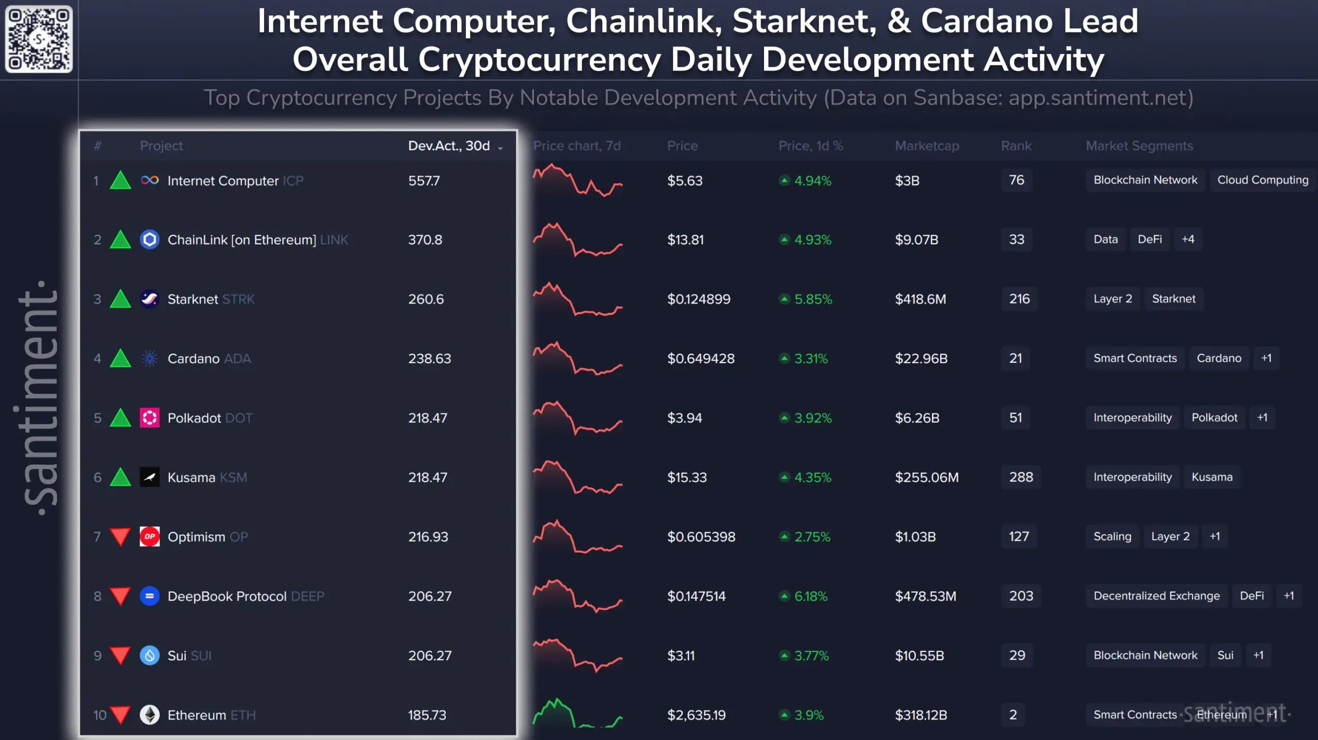 According to the latest data from Santiment, Internet Computer (ICP) continues to dominate blockchain development activity, posting the highest 30-day average with a score of 557.7.