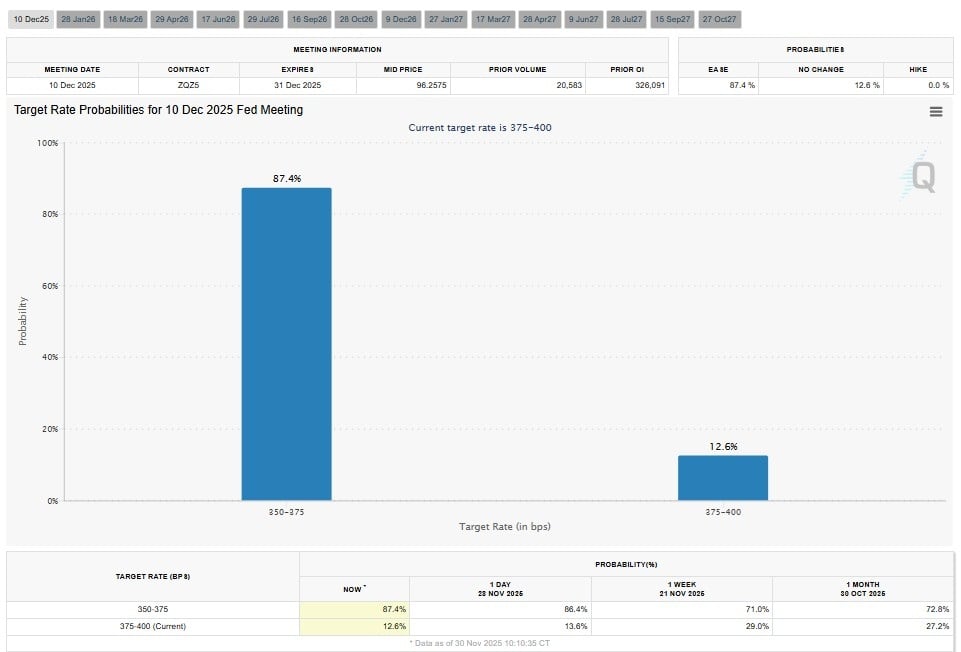 Another key moment comes on December 10, when the Federal Reserve gives its next interest-rate decision. Current data shows an 87% chance of a rate cut. If the cut happens, it could lift market confidence, bring in more institutional money, and increase liquidity for risk-on assets.