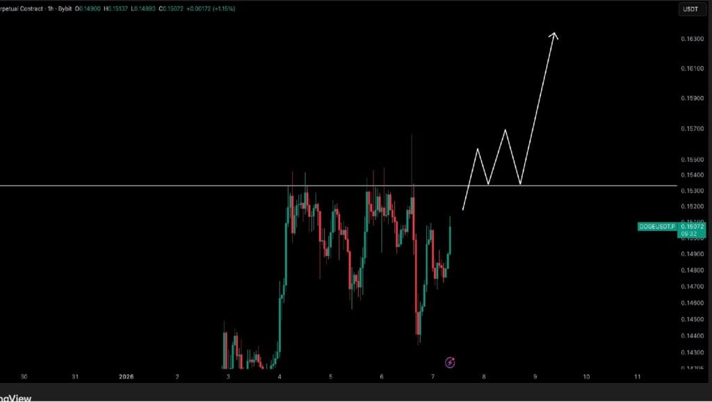 The structure shows higher lows forming, suggesting buyers remain active even as momentum pauses. If price breaks above $0.1530 and successfully retests that level as support, the technical target sits near $0.1630.