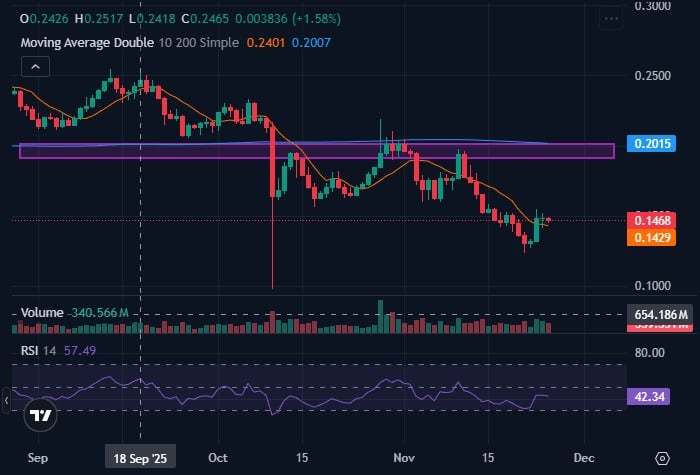 A successful rebound would allow the price to retest the critical $0.155 to $0.16 zone, which remains the most important level to reclaim for any sustained upside.