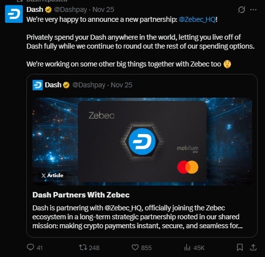 Fundamental developments surrounding the Dash ecosystem are also contributing to the renewed optimism. The project recently secured a strategic long-term partnership with Zebec, expanding its reach and reinforcing its role within the privacy-focused segment of the crypto industry.