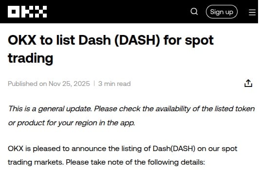 Dash Re-Listed on OKX Amid Strategic Partnership With Zebec