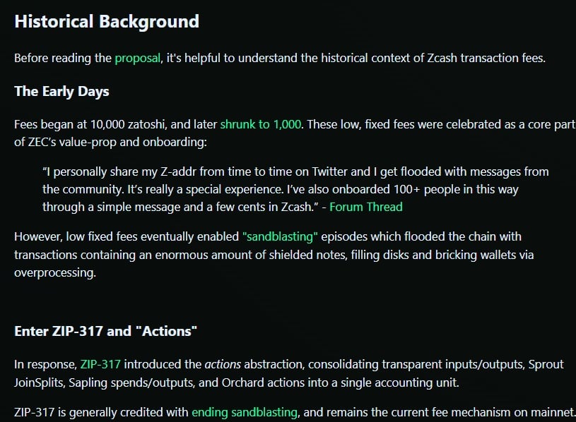 The Zcash team has introduced a proposal to implement dynamic fees that aim to protect users from network issues caused by rising transaction costs as the value of $ZEC increases. In the past, fees were fixed at 10,000 zats and later at 1,000 zats.