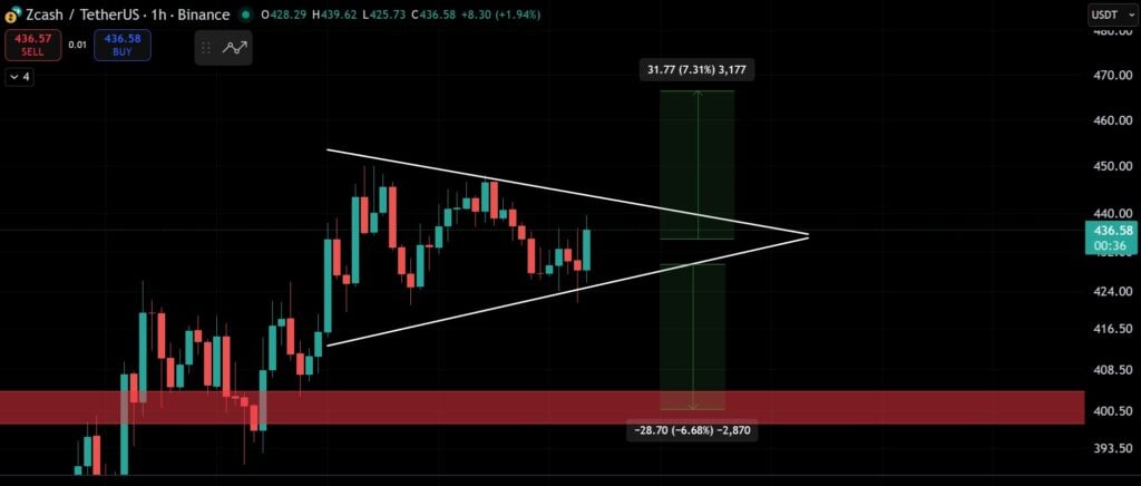 Zcash’s market performance has struggled recently, trading around $400 after retracing from highs above $700. Even so, technical analysis shows the asset forming a symmetrical triangle pattern, hinting at a potential bullish breakout if momentum aligns with broader market strength.