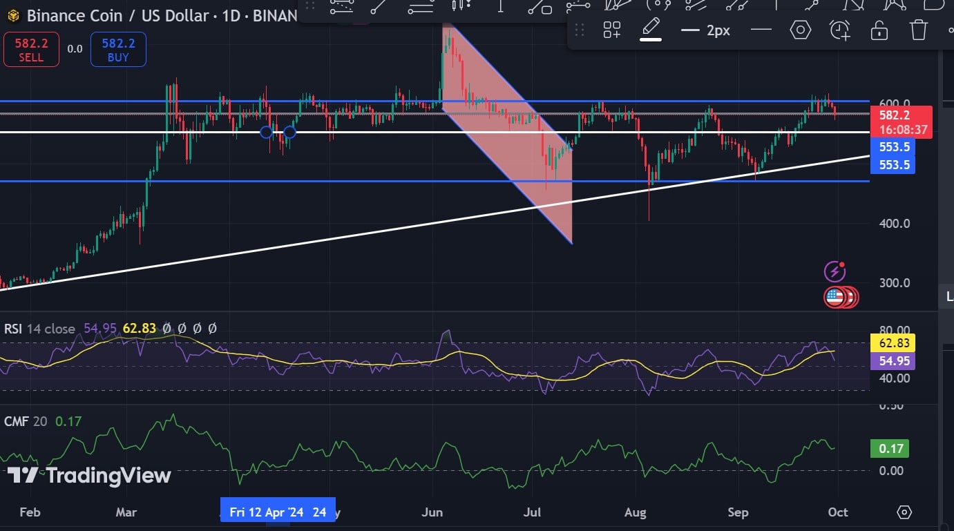 Therefore, based on prevailing market sentiment, BNB will retrace to the critical support level at $553 before starting an uptrend again.
